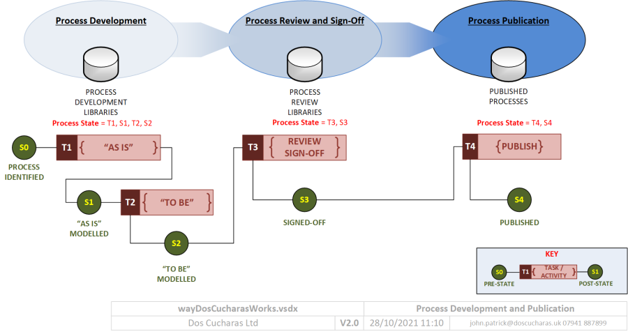 We have a clear and no-nonsense approach to process development and publication with a state-transition methodology, equally applicable to waterfall and agile environments.